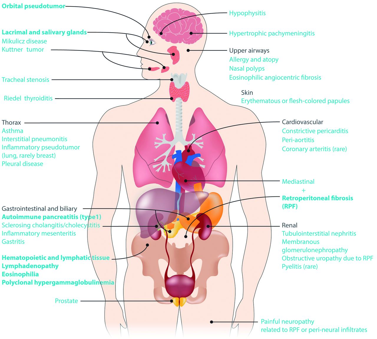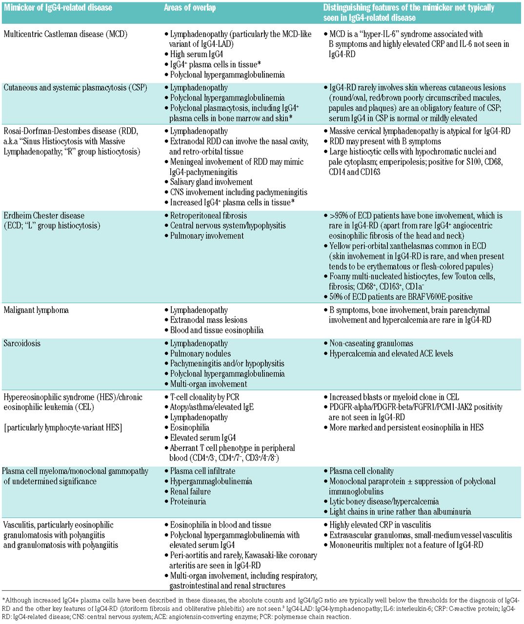 Kamisawa et al. IgG4-related systemic disease is an emerging disease process that manifests with a constellation of features most commonly but not exclusive to swelling and tuberous growth in the lacrimal and salivary glands potentially involving many other organ systems. IgG4-related disease is usually treated with systemic steroids like prednisone. IgG4-RD is diagnosed on combination of typical radiological findings. Immunosuppressive medications azathioprine or mycophenolate mofetil and biologics rituximab or bortezomib may be used in those who dont respond to steroids or for longer-term management. IgG4 related disease IgG4-RD is an immune mediated condition presenting with mass forming lesions that lead to permanent organ injury and death if left untreated. IgG4 related disease is a systemic autoimmune disease that involves multiple organs 60 - 90 of the time therefore clinicians should be aware that IgG4 related disease can mimic some autoimmune rheumatic diseases and place it as a differential diagnosis when multi-organ disease with systemic features is involved.